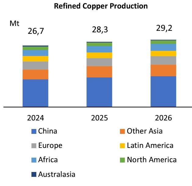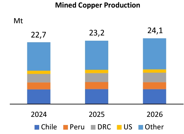 «Рынок будет в профиците в размере 200 тыс. т в 2024 г. и сбалансирован в 2025 г., поскольку рост спроса на медь, как ожидается, будет опережать рост мировой экономики в целом, благодаря ускоренному росту производства возобновляемой энергии и электрифицированного транспорта, а также продолжающейся тенденции к росту потребления электроэнергии на душу населения».