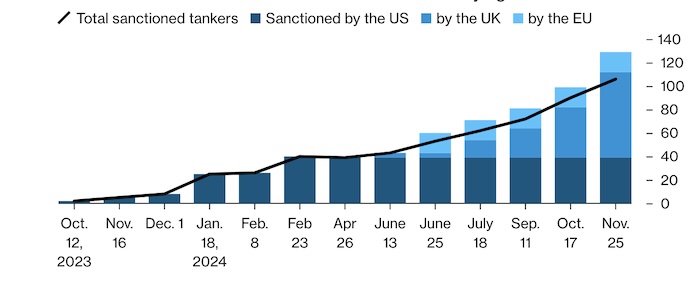 Танкеры, попавшие под санкции за перевозку российской нефти. Источник: Bloomberg