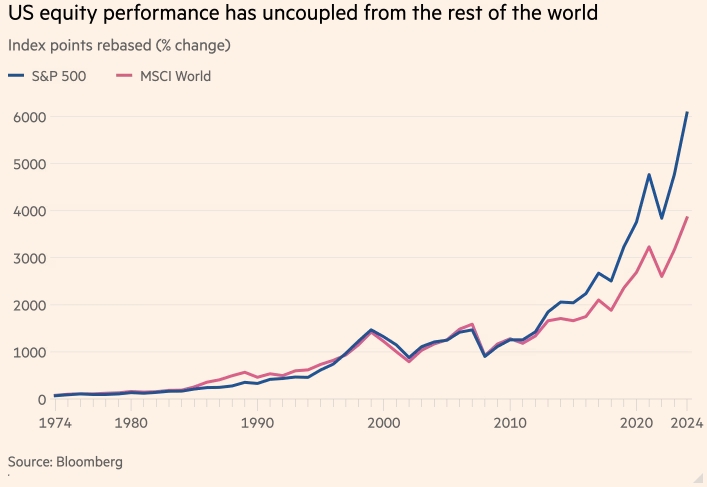 Акции США в настоящее время составляют 70% от рыночной стоимости акций развитых рынков мира в широко используемом мировом бенчмарке MSCI. Это больше, чем 30%, которые они занимали в 1980-х годах. Рост, вызванный сильным ростом в течение многих лет, поднял цену акций США до самого высокого уровня по сравнению с мировыми акциями за всю историю учёта, который ведётся более века.