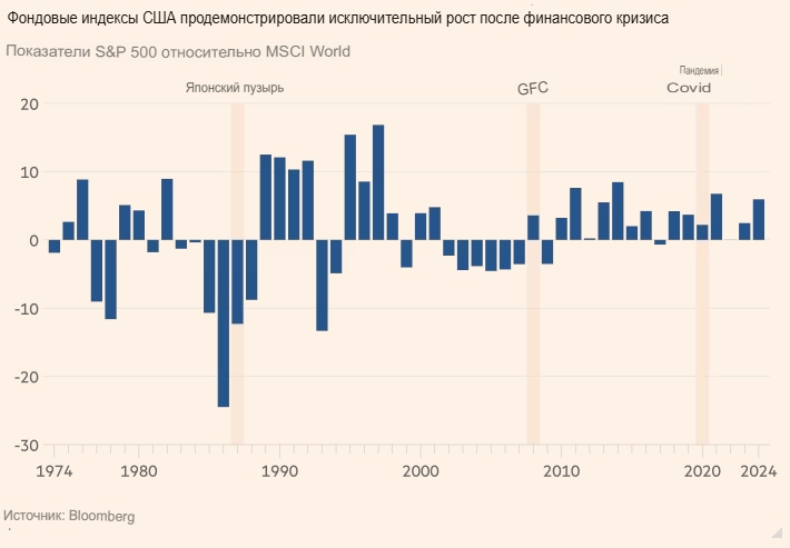 По мнению аналитиков, акции США выглядят исключительными, поскольку «остальной мир не растёт», в то время как в абсолютном выражении они «довольно нормальны» по сравнению с последним десятилетием.