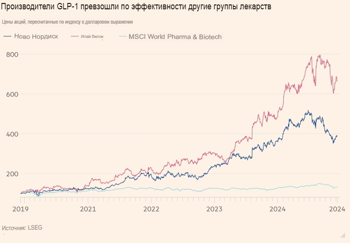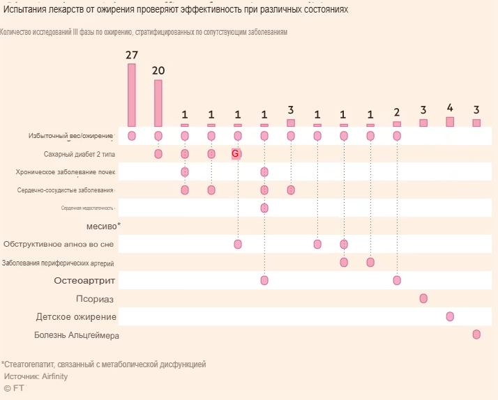 По данным поставщика данных Airfinity, в настоящее время проводится 66 поздних испытаний препаратов ГПП-1 для лечения ожирения, диабета и ряда других состояний, связанных с избыточным весом. Перспектива более широкого использования этих препаратов является одной из причин, по которой аналитики Goldman Sachs прогнозируют рынок в размере 130 миллиардов долларов к 2030 году.