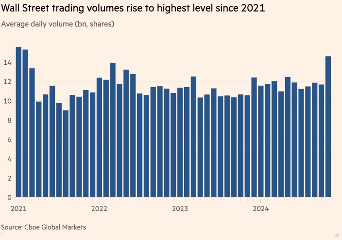 По данным Cboe Global Markets, в ноябре объёмы торгов акциями США выросли на 38% по сравнению с тем же периодом прошлого года. Это рекордный показатель с начала 2021 года, когда на рынке были популярны акции-мемы. В ноябре объёмы торгов превысили среднегодовые показатели.