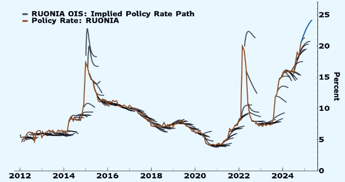 По оценкам экспертов Bloomberg Economics, 20 декабря Банк России повысит процентную ставку на 200 базисных пунктов до 23% годовых.
