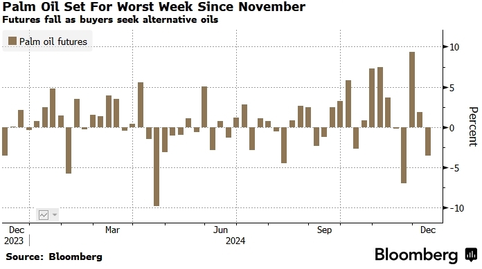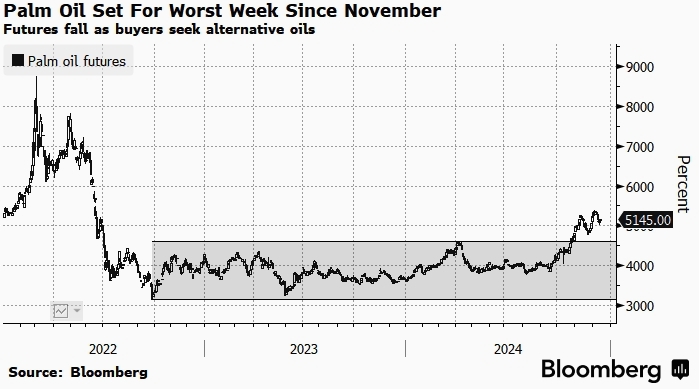 Цены на пальмовое масло упали и находятся на пути к недельному снижению, поскольку недавний скачок цен побуждает покупателей искать альтернативные масла.