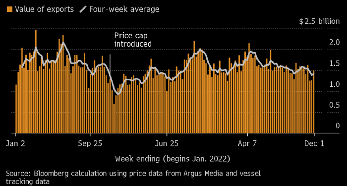 Желтым — морской экспорт нефти из РФ (в млрд USD в неделю), серым — среднее четырехнедельное значение данного показателя. Источник: Bloomberg