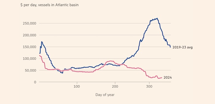 По данным Spark Commodities, в ноябре стоимость краткосрочной аренды современного СПГ-танкера — основного типа судов на рынке — в Атлантическом бассейне составляла в среднем 19 700 долларов в день. Это самая низкая цена с 2019 года. С лета фрахт подешевел почти на 80%, поскольку поставка новых судов опережает рост мирового производства СПГ.