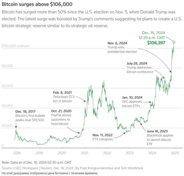 В понедельник курс биткоина достиг рекордного уровня, превысив отметку в 106 000 долларов, после того как избранный президент США Дональд Трамп объявил о планах создания стратегического резерва биткоинов в США, аналогичного стратегическому резерву нефти. Это заявление вызвало энтузиазм среди сторонников криптовалюты.