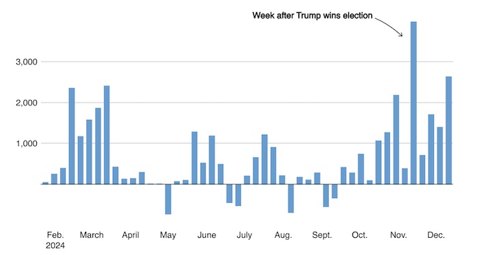 Биткоин и криптовалюты оказались в центре внимания, поскольку инвесторы рассчитывают, что администрация Трампа создаст более благоприятную регуляторную среду. С начала 2024 года биткоин вырос примерно на 150%.