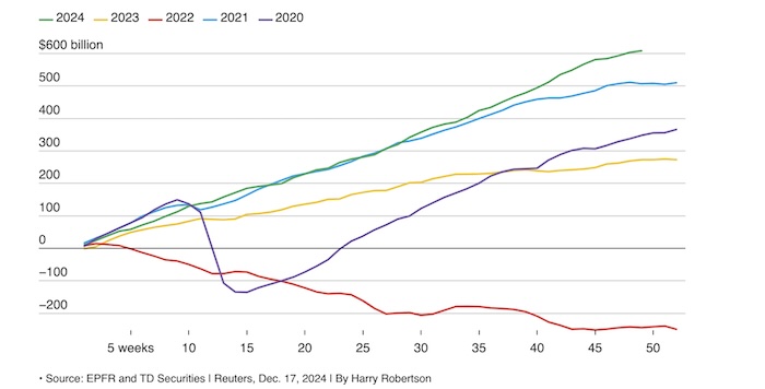 По данным EPFR, к середине декабря в облигационные фонды развитых и развивающихся рынков поступило $617 млрд. Это превышает показатель 2021 года ($500 млрд) и делает 2024 год рекордным.
