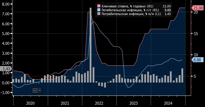 Эксперт Совкомбанка отмечает, что Банк России несколько смягчил сигнал и указал на то, что «будет оценивать целесообразность дальнейшего повышения ключевой ставки на ближайшем заседании». «С точки зрения регулятора сейчас важно сохранять жесткую риторику, чтобы не было преждевременного смягчения финансовых условий, — полагает Васильев. — Это позволит лучше донести до экономики сегодняшнее решение ЦБ. В базовом сценарии мы ожидаем, что инфляция будет замедляться медленно и Банк России будет удерживать ключевую ставку на текущем уровне 21% весь 2025 год».