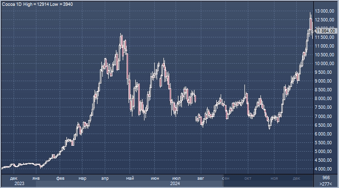 Рынок какао остыл после того, как в апреле он вырос до чуть менее $12 000 за тонну, на ожиданиях роста урожая в Западной Африке. Ралли возобновилось в ноябре, поскольку погода стала неблагоприятной для развития урожая, что ослабило надежды на существенное восстановление объемов предложения.