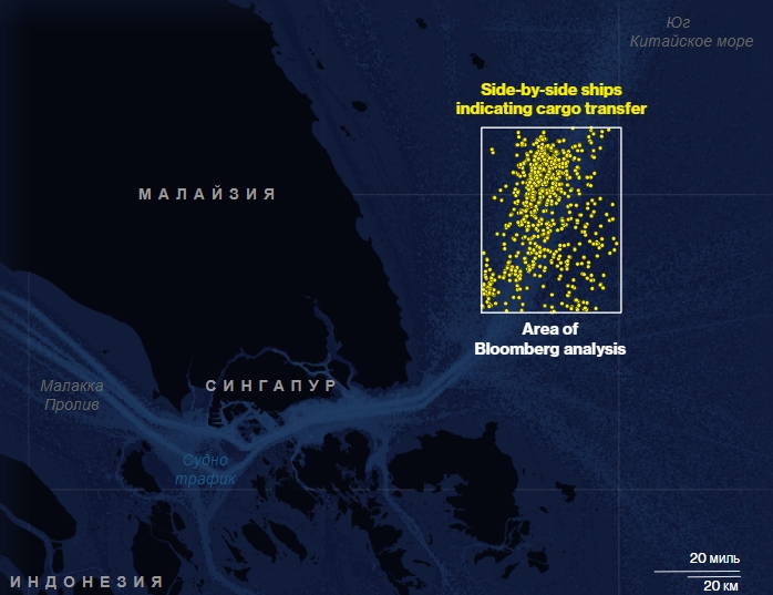 По данным анализа Bloomberg фиксации близкого расположения судов в дни с легкодоступными спутниковыми снимками, операторы, вероятно, перекачивают нефть между судами в этом районе, по крайней мере, в два раза чаще, чем в 2020 году. В самые загруженные дни было замечено более дюжины таких отдельных встреч.
