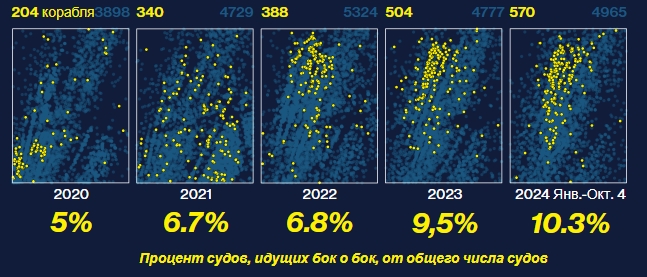 TankerTrackers.com, который внимательно отслеживает всю активность судов, насчитал 409 случаев наблюдения судов в районе острова Риау — большего региона, чем воды, проанализированные Bloomberg — с января по конец октября. Это сопоставимо с 279 за весь 2023 год, говорит Самир Мадани, соучредитель компании по отслеживанию судов.