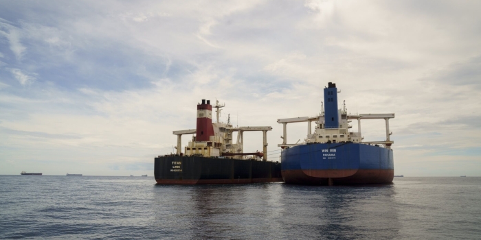 Суда Titan и Win Win бок о бок в водах к востоку от Малайзии 4 октября, готовятся к перевалке с судна на судно. Фото: Bloomberg