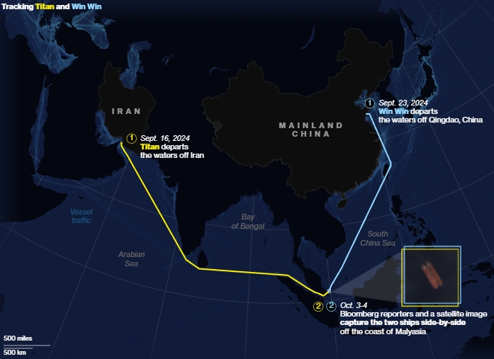 Затем Titan снова появился, нагруженный нефтью, и направился в Юго-Восточную Азию, часто прокладывая немыслимо прямые линии навигации в открытом море. К началу октября он пересекал Сингапурский пролив на восток. Данные отслеживания судов и спутниковые снимки, проанализированные Bloomberg, показывают, что судно неоднократно проходило по одному и тому же маршруту из вод около Ирана в Южно-Китайское море.