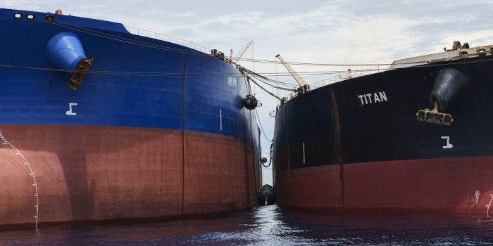 Морское право требует, чтобы суда, осуществляющие перевозки с судна на судно, уведомляли прибрежные страны о своих намерениях и следовали согласованным процедурам. Фотограф: Bloomberg