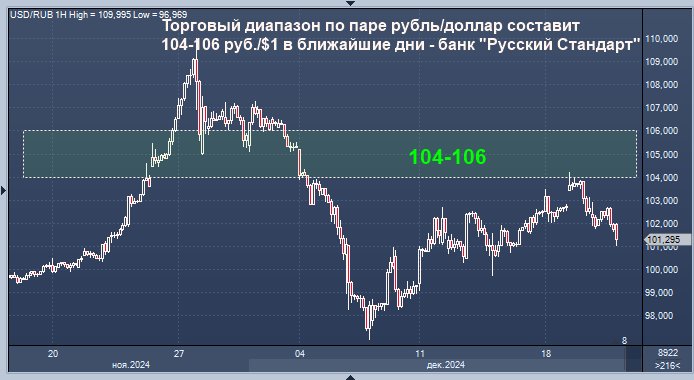 Торговый диапазон по паре рубль/доллар, скорее всего, составит в ближайшие дни 104-106 руб./$1, по паре рубль/евро - 108-110 руб./EUR1, полагает директор департамента операций на финансовых рынках банка "Русский Стандарт" Максим Тимошенко.