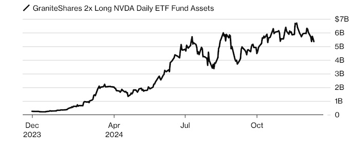 Инструменты, позволяющие инвесторам делать ставки на популярные акции, пережили настоящий бум. В ETF на отдельные акции — фонды, отслеживающие одну компанию, но использующие производные инструменты для усиления бычьих или медвежьих ставок — инвесторы вложили рекордные $6,5 млрд. Главным победителем в этой категории стал фонд от GraniteShares, который обеспечивает двойную дневную доходность рыночного лидера Nvidia Corp. В стратегии под тикером NVDL, на пике вращались активы на сумму $6,7 млрд с доходностью более 350% за год. Похожую динамику показали фонды, отслеживающие MicroStrategy, Tesla Inc. и Coinbase Global Inc.