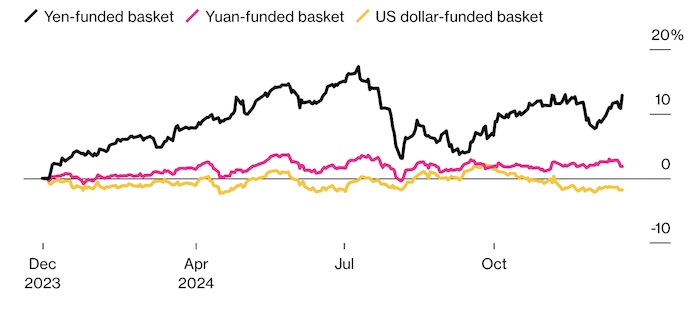 В октябре настроения на валютном рынке получили новый импульс: премьер-министр Японии Сигэру Исиба в первый день работы заявил, что экономика далека от готовности к ужесточению денежно-кредитной политики. В результате корзина валют развивающихся рынков, финансируемая иеной, принесла около 13% дохода за год, несмотря на волатильность. Японская валюта не оправдала прогнозы таких компаний, как BNY, предсказывавших ее укрепление до 100 за доллар из-за закрытия коротких позиций. Это стало своеобразным оправданием для валютных брокеров вроде AT Global Markets и Pepperstone Group, которые быстро предсказали возрождение печально известной стратегии.