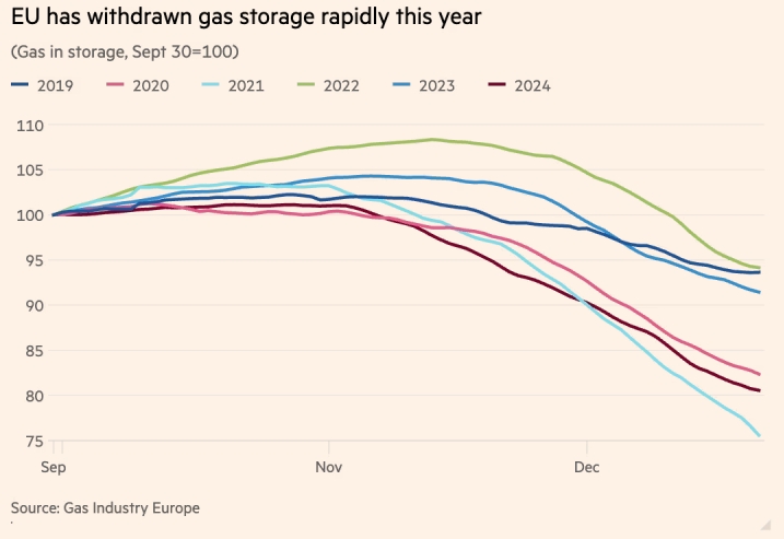 В настоящее время ЕС опустошает свои газовые хранилища с беспрецедентной скоростью с момента энергетического кризиса, который произошёл три года назад. Это связано с тем, что холодная погода и сокращение импорта газа по морю повышают спрос.