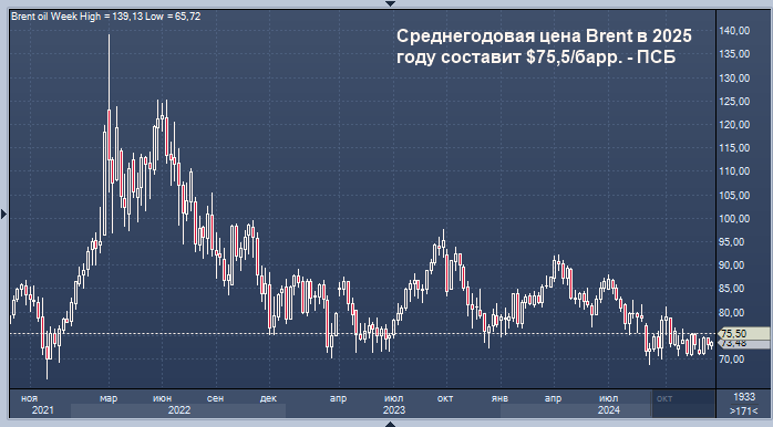 Среднегодовая цена нефти марки Brent в 2025 году составит $75,5 за баррель, говорится в инвестиционной стратегии Промсвязьбанка (ПСБ) на следующий год.