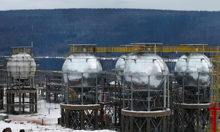 Общий вид резервуаров для сжиженных углеводородных газов (СУГ) на объекте, принадлежащем Иркутской нефтяной компании (ИНК), в Иркутской области, Россия, 9 марта 2019 г. REUTERS/Василий Федосенко