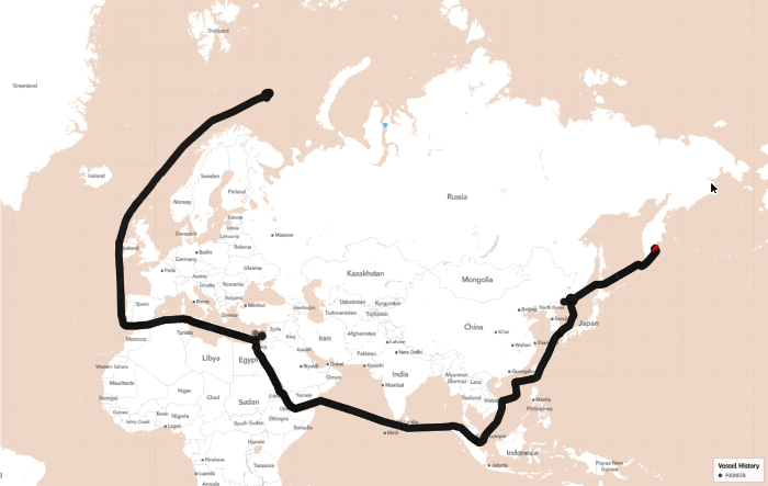 Пионер был замечен на спутниковых снимках, когда он принимал первую отгрузку с объекта «Арктик СПГ 2» в начале августа — несмотря на маскировку перемещения с помощью вводящей в заблуждение информации о местоположении — но затем провел более четырех месяцев в поисках клиента.