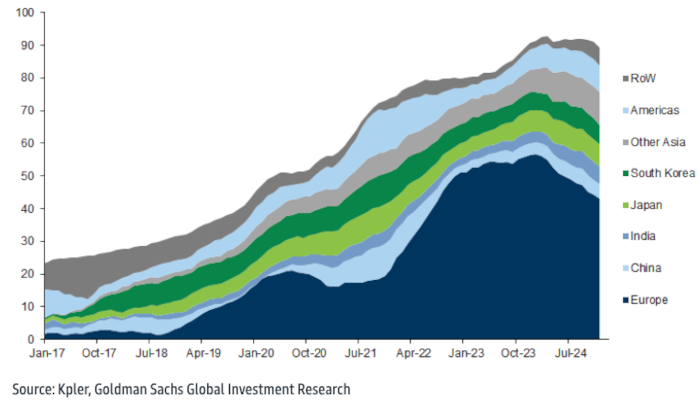 Экспорт СПГ из США по странам и регионам мира в млн тонн в год. Источник: Goldman Sachs