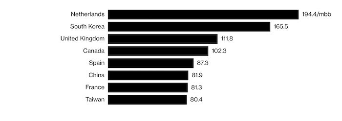 Нидерланды продолжают лидировать по импорту нефти из США, закупив 194 млн баррелей в 2024 году, что на 12% больше, чем в прошлом году. Южная Корея стала вторым по величине импортером американской нефти в 2024 году, закупив около 166 млн баррелей. Южная Корея стремится компенсировать потерю части нефти из Казахстана после того, как эта страна начала поставлять больше нефти в Италию.