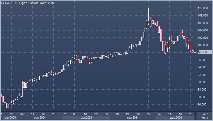 27 декабря курс рубля несколько снизился по отношению к доллару США после того, как Центробанк объявил о прекращении части поддержки валюты в первую рабочую неделю 2025 года после новогодних каникул.