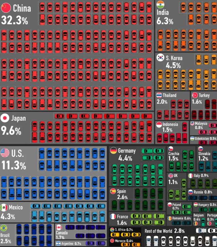 Почти треть этих автомобилей (32,2%) была произведена в Китае, что почти в три раза превысило показатель второго крупнейшего производителя, США, с долей рынка в 11,3%. Объем производства автомобилей в Китае в два с лишним раза превышает внутренний спрос, что позволяет отправлять значительную часть машин на экспорт.