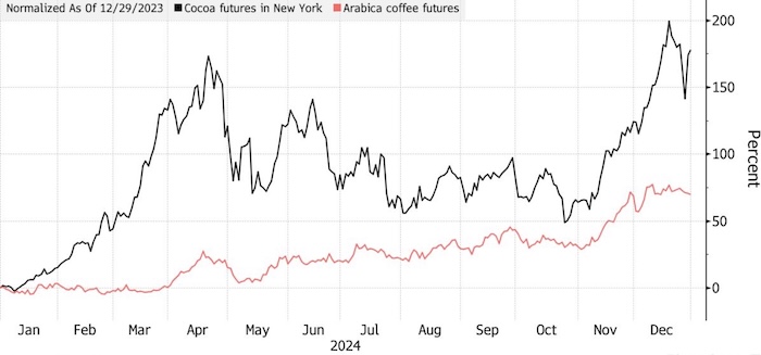 Какао и кофе оказались лидерами роста среди сырьевых товаров в 2024 году, показав непрерывное ралли, которое наверняка заставит поморщиться любителей шоколада и капучино в ближайшие месяцы. Ведущие производители кофе рассматривают повышение цен как один из способов смягчить для себя последствия удорожания зерен арабики. Любители шоколада уже несколько месяцев страдают от роста цен на какао: шоколадные батончики становятся дороже и меньше. Ожидается, что эта тенденция продолжится в 2025 году.