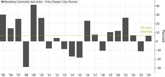 Несмотря на впечатляющий рост по всему спектру рынка от кофе до золота, ключевой показатель цен на сырьевые товары оказался на уровне среднегодовых долгосрочных значений. Спотовый индекс сырьевых товаров Bloomberg, отслеживающий 24 энергетических, металлических и сельскохозяйственных контракта, вырос на 6,3% за год, компенсировав снижение 2023 года. Ралли фьючерсов на золото, крупнейшего компонента индекса, помогло поднять BCOM, хотя падение цен на сельскохозяйственные культуры, такие как пшеница, кукуруза и соя, ограничило показатели индекса.
