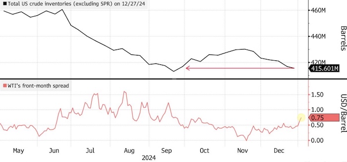 Запасы сырой нефти в США сократились на 1 млн баррелей в последнюю полную неделю 2024 года, при этом запасы в важнейшем хранилище Кушинга, штат Оклахома, остались на 17-летнем сезонном минимуме. Сокращение запасов привело к росту премии по фьючерсным контрактам на нефть West Texas Intermediate с поставкой в ближайшие месяцы. Спред между ближайшими фьючерсами достиг трехмесячного максимума, что указывает на дефицит предложения на рынке.