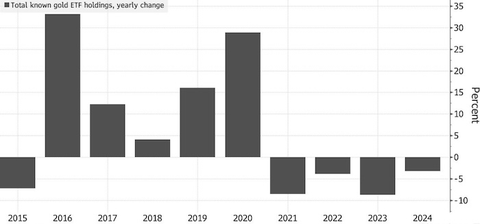 Инвесторы продавали обеспеченные золотом биржевые фонды четвертый год подряд, при этом активы сократились на 3,2% в 2024 году. Хотя оптимизм в отношении снижения процентных ставок ФРС в 2024 году помог ETF на золото частично восстановить позиции, результаты выборов в США в ноябре прервали эту динамику. Укрепление доллара после победы Дональда Трампа на выборах привело к новой распродаже золотых ETF, при этом цены на золото снизились с исторического максимума, поскольку инвесторы перенаправили деньги в другие активы, включая акции и биткоин.