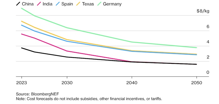 Затраты на зеленый водород будут снижаться медленнее. Источник: Bloomberg