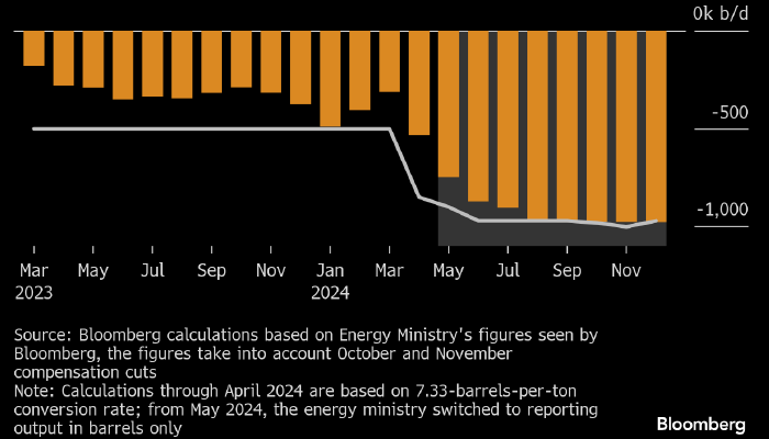 По их данным, в прошлом месяце страна добывала в среднем 8,971 млн б/д сырой нефти, что на 7 тыс. б/д ниже декабрьской квоты ОПЕК+.