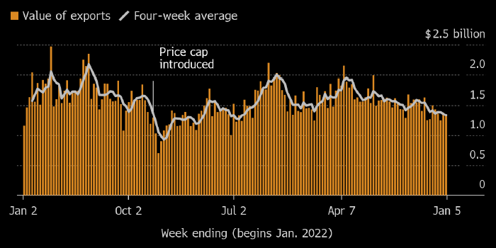 Впрочем, сокращение физического объема экспорта нефти из РФ было почти полностью компенсировано ростом экспортных цен. Поэтому в денежном выражении морской экспорт нефти из РФ снизился на неделе до 5 января всего на $20 млн до $1,35 млрд.