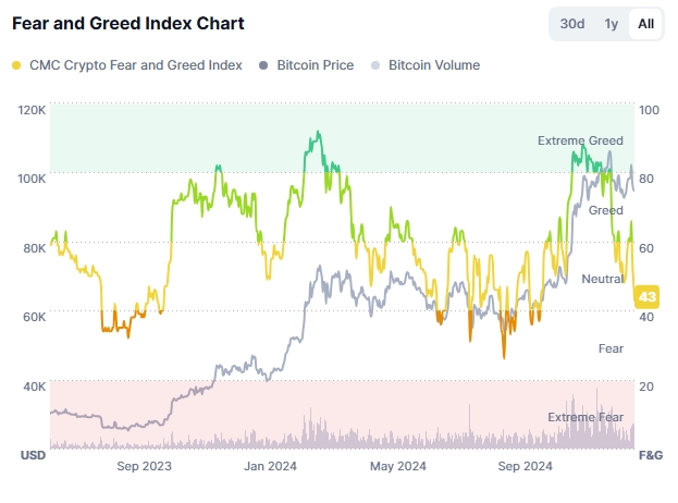 По состоянию на 3:20 утра по восточному времени в пятницу биткоин торговался по $94,708.791, а показатель составлял 42.