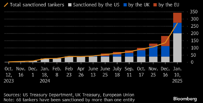 Объявленные Вашингтоном в пятницу 10 января новые санкции в отношении так называемого российского теневого флота танкеров создают угрозу заметного сокращения экспорта нефти из РФ, пишут стратеги Citi. В качестве подтверждения своего прогноза они указывают на значительное расширение календарных спредов во фьючерсах на нефть Brent, которое последовало за объявлением о санкциях.