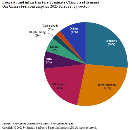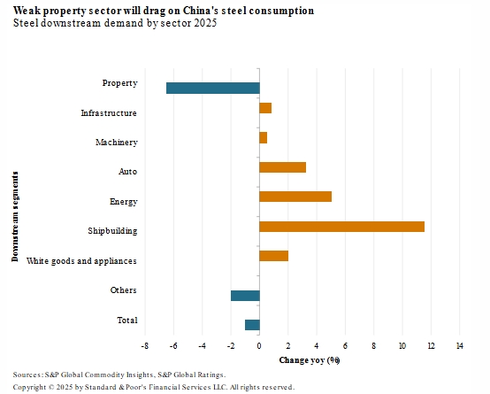 Хотя спрос на сталь со стороны сектора недвижимости и выше, чем в прошлом году, он, скорее всего, упадет на 6,5% в 2025 году и станет основным тормозом (см. диаграмму 2). Растущий спрос со стороны обрабатывающей промышленности, такой как автомобилестроение, энергетика и судостроение, частично смягчит общую слабость спроса.
