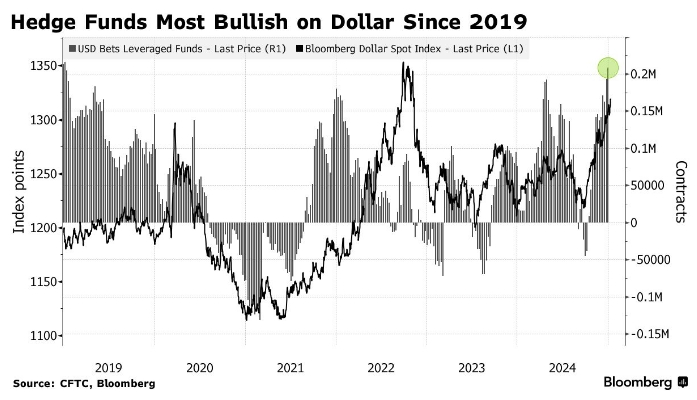 Инвесторы, включая хедж-фонды, поддерживают оптимистичный взгляд на доллар, и их позиции по доллару сейчас достигли максимума с января 2019 года, согласно данным Комиссии по торговле товарными фьючерсами.