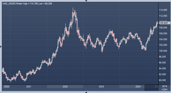 Индекс доллара, который измеряет курс американской валюты по отношению к шести другим валютам, вырос на 0,20% до 109,58, что недалеко от 26-месячного максимума в 110,17, достигнутого в понедельник. В октябре 2022 года он достиг 114,78, что является самым высоким показателем с 2002 года.