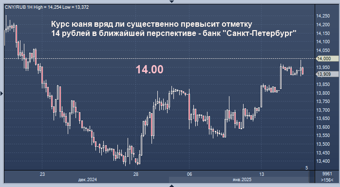 Курс пары рубль/юань вряд ли существенно превысит отметку 14 руб./юань в ближайшей перспективе, а нефтяные цены могут задержаться вблизи $80 за баррель Brent, считают аналитики банка "Санкт-Петербург".