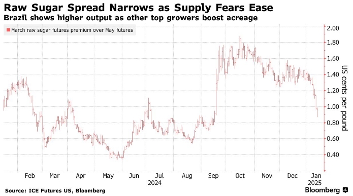 Снижение беспокойства о поставках привело к уменьшению разницы в ценах на сырой сахар, при этом мартовский фьючерсный контракт установил премию в 0,87 цента по сравнению с майским контрактом, что является самым низким показателем внутри дня с сентября.