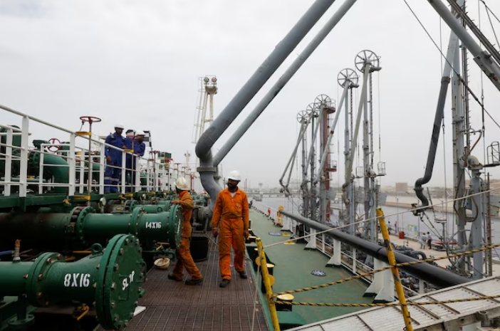 Члены экипажа проверяют палубу российского нефтеналивного судна Pure Point, перевозящего сырую нефть, стоящего на якоре в порту Карачи, Пакистан, 13 июня 2023 г. REUTERS/Akhtar Soomro