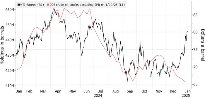 С начала года цена на нефть Brent выросла на 10% из-за холодной погоды, стимулирующей спрос, падения запасов в США и множества рисков для поставок. Помимо ограничений против России, трейдеры обеспокоены тем, что будущая администрация Трампа может ужесточить санкции против Ирана и ввести торговые пошлины, которые нарушат нефтяные потоки или спровоцируют ответные меры.