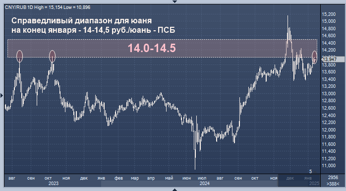 Справедливый диапазон для пары рубль/юань на конец января - 14-14,5 руб./юань , считает начальник отдела экономического и отраслевого анализа Промсвязьбанка (ПСБ) Евгений Локтюхов.