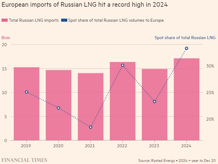 Импорт российского СПГ в Европу достиг рекордного уровня в 2024 году. Общий объем российского импорта СПГ. Спотовая доля от общего объема поставок российского СПГ в Европу. FT. Источник: Rystad Energy 2024 = год по 20 декабря