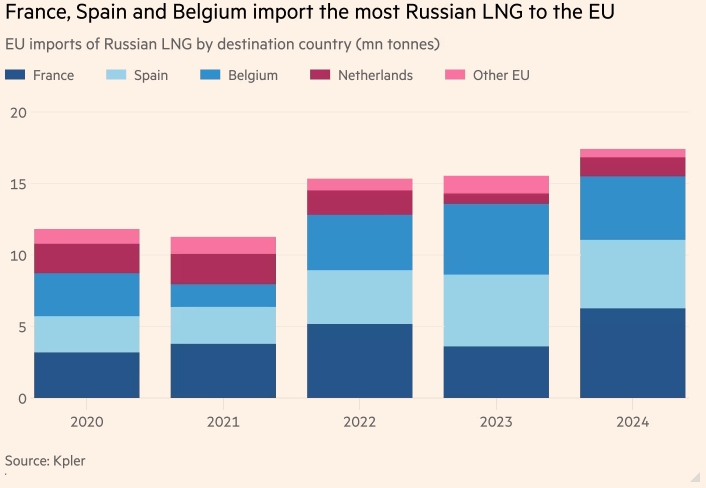 Из-за опасений сокращения поставок после того, как Москва постепенно прекратила подачу трубопроводного газа в Европу, ЕС не стал вводить запрет на СПГ, как это было сделано с российским углём, или устанавливать предельную цену на российский СПГ, как это было с российской нефтью.
